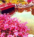 Japanese house, a goldfish pond and a wooden bridge across a stream are