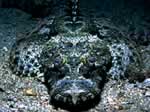eponymous crocodilefish lying in wait on the sandy floor, its large flat snout